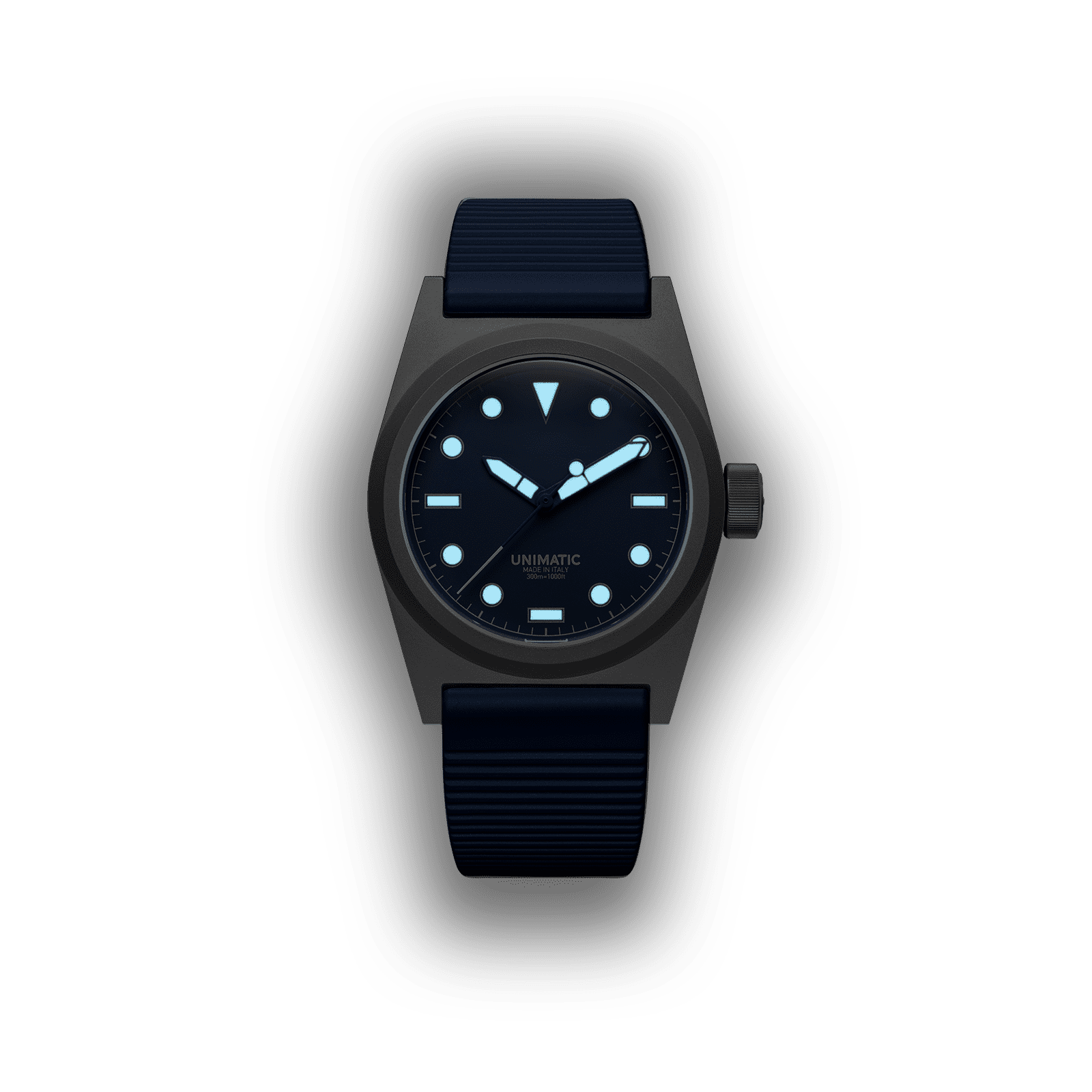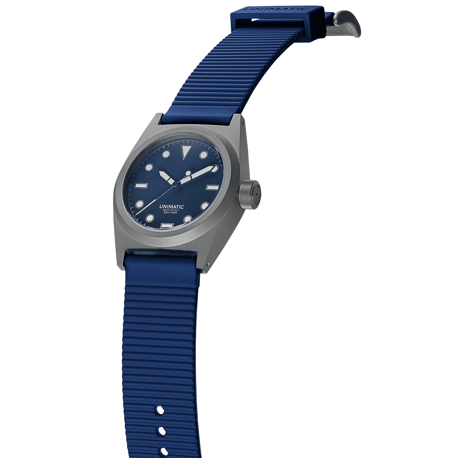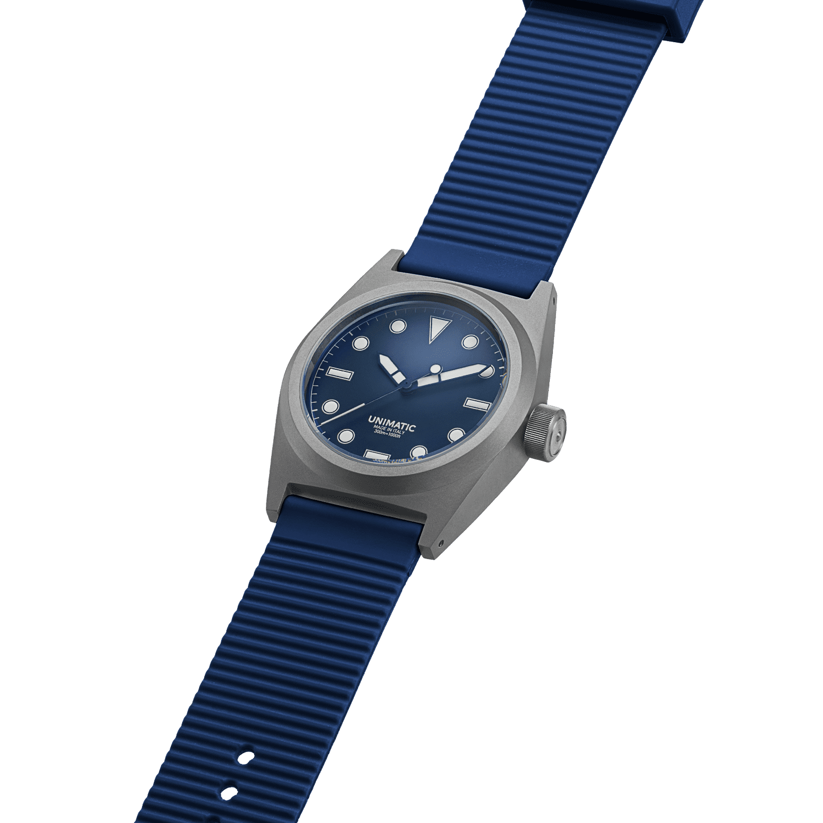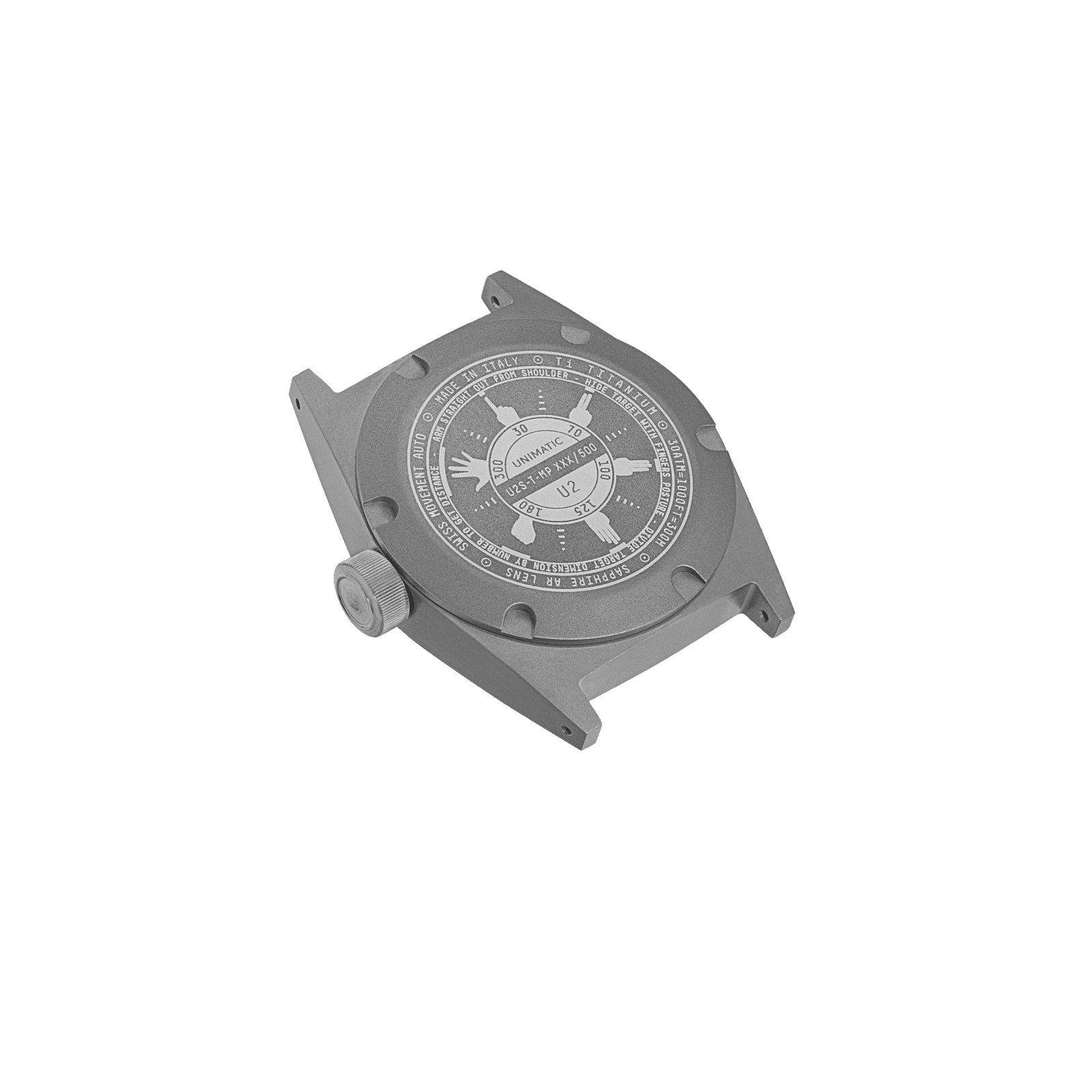 Modello Due ref. U2S-T-MP in una colorazione senza tempo che fonde il BLU NOTTE con le calde tonalità di grigio della cassa in titanio grado II sabbiato, con accenti in argento per la grafica e le finiture completate da indici bianchi in Super-LumiNova®BGW09 che brillano di blu.