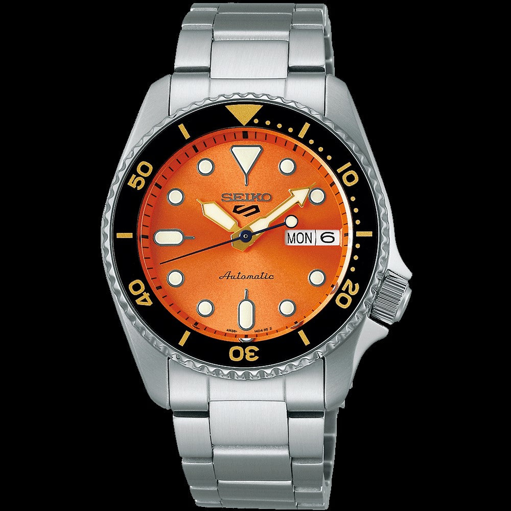 Il segnatempo Seiko 5 Sports SRPK35K1 è la riedizione del famoso SKX013K1. È l'orologio sportivo contemporaneo e resistente che segna il 55° anniversario della linea 5 Sports. Realizzato interamente in acciaio inossidabile, questo segnatempo arancione e vivace discende dai Quartz Divers lanciati negli anni Ottanta. Questo modello è dotato di una lunetta girevole graduata e di un fondello.