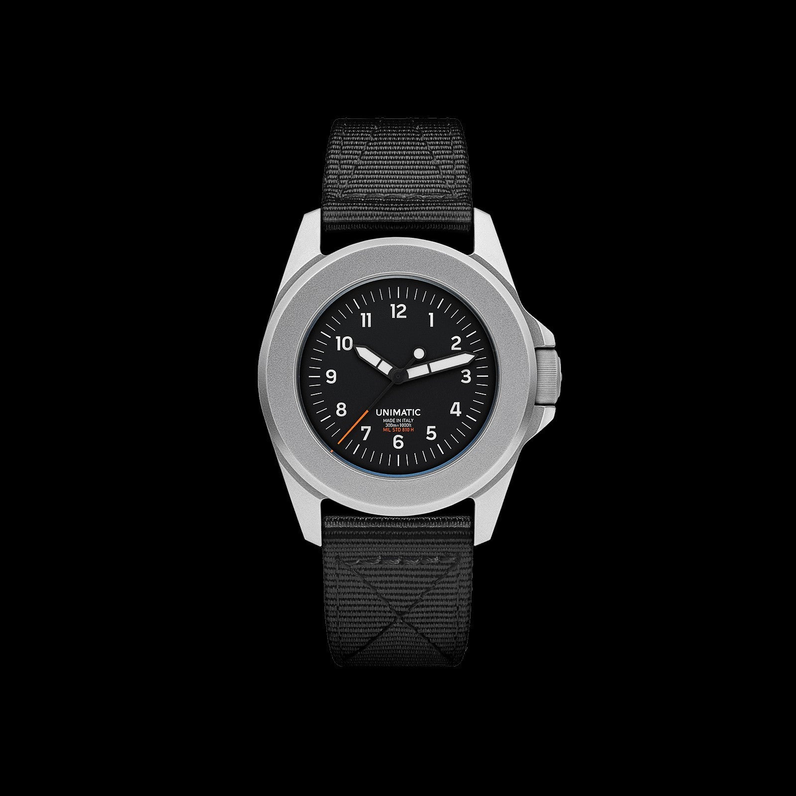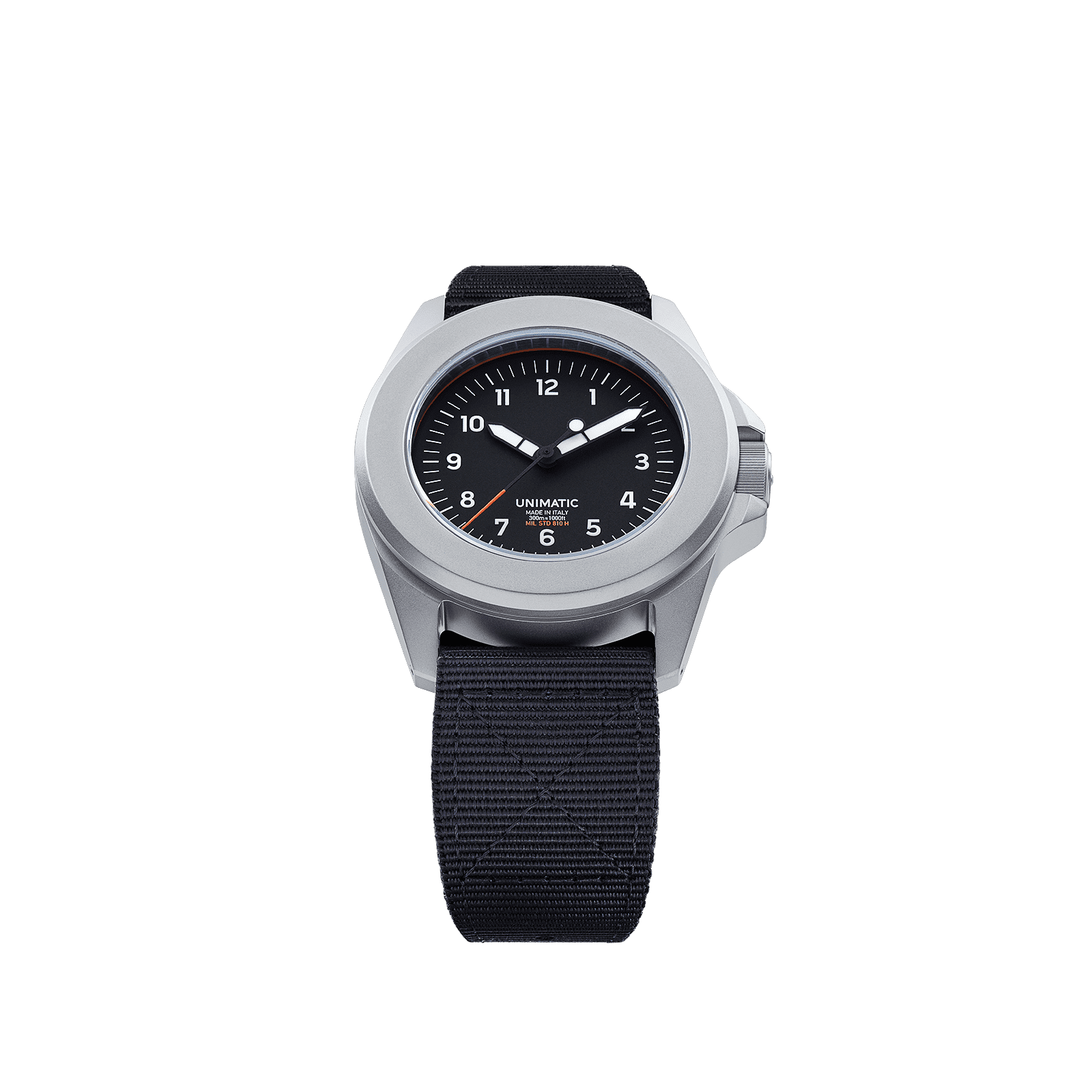La precisione del cronometraggio è garantita dal movimento al quarzo Seiko VH31 con lancetta dei secondi a scatto/spostamento, dotata di sistema antiurto in TPU Made in Italy. È dotato di cinturino in nylon nero a due pezzi con ferramenta sabbiata in acciaio inossidabile firmato UNIMATIC, che si adatta alle anse da 22 mm.