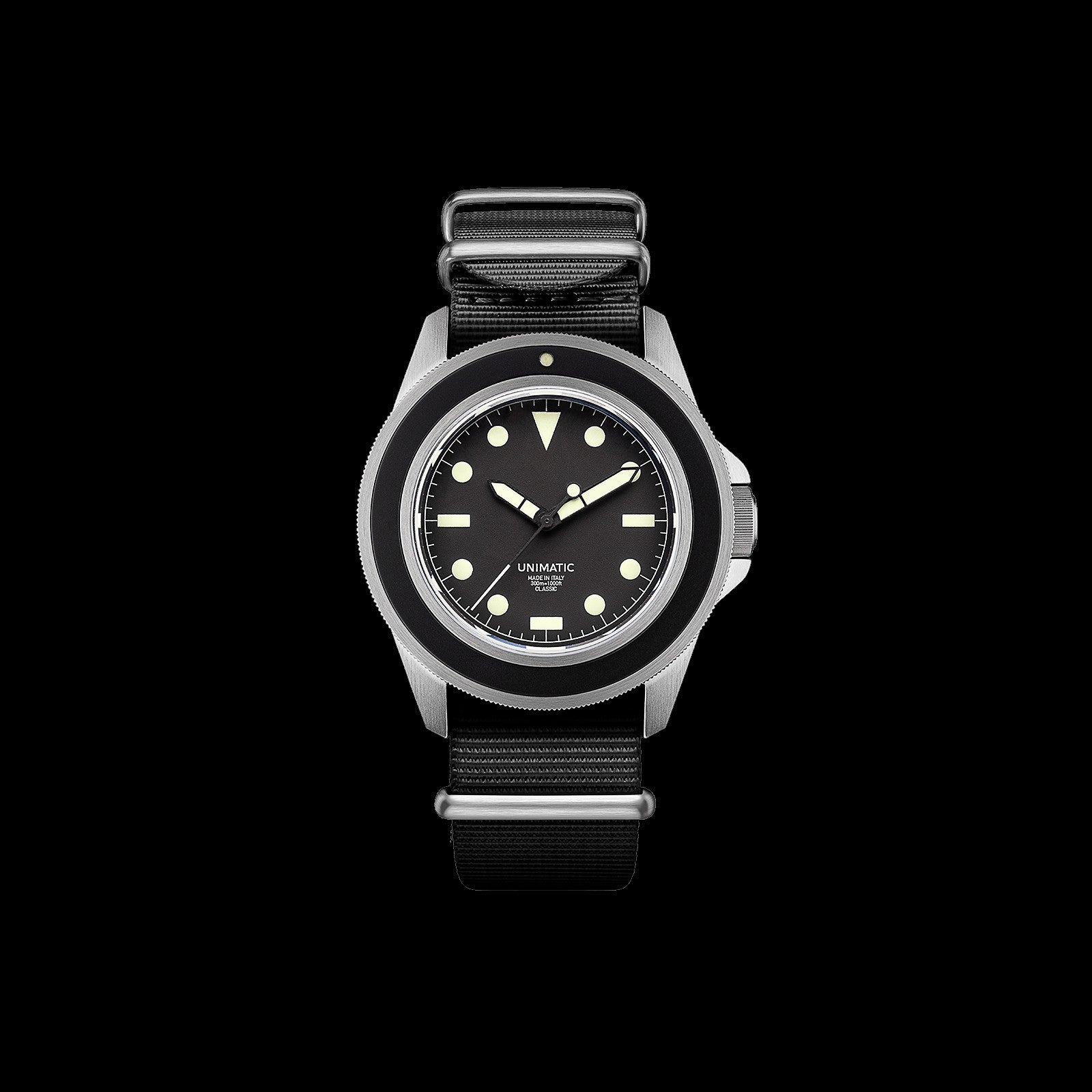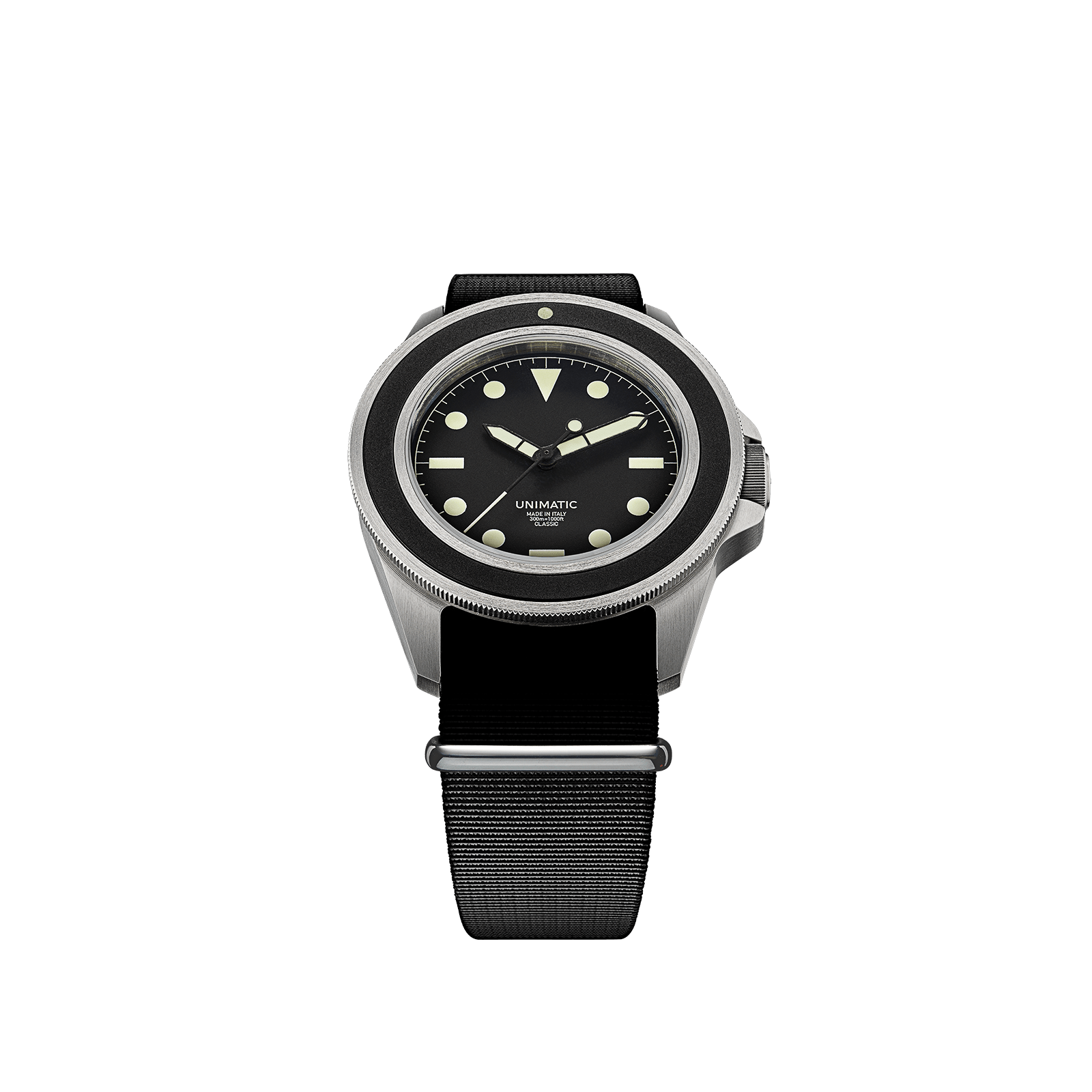 La precisione del cronometraggio è garantita dal movimento automatico NH35A regolato a 21600 bph, con riserva di carica di 41 ore e lancetta dei secondi con hacking. È dotato di un cinturino nero Unimatic in nylon NATO resistente con hardware in acciaio inossidabile spazzolato firmato Unimatic.