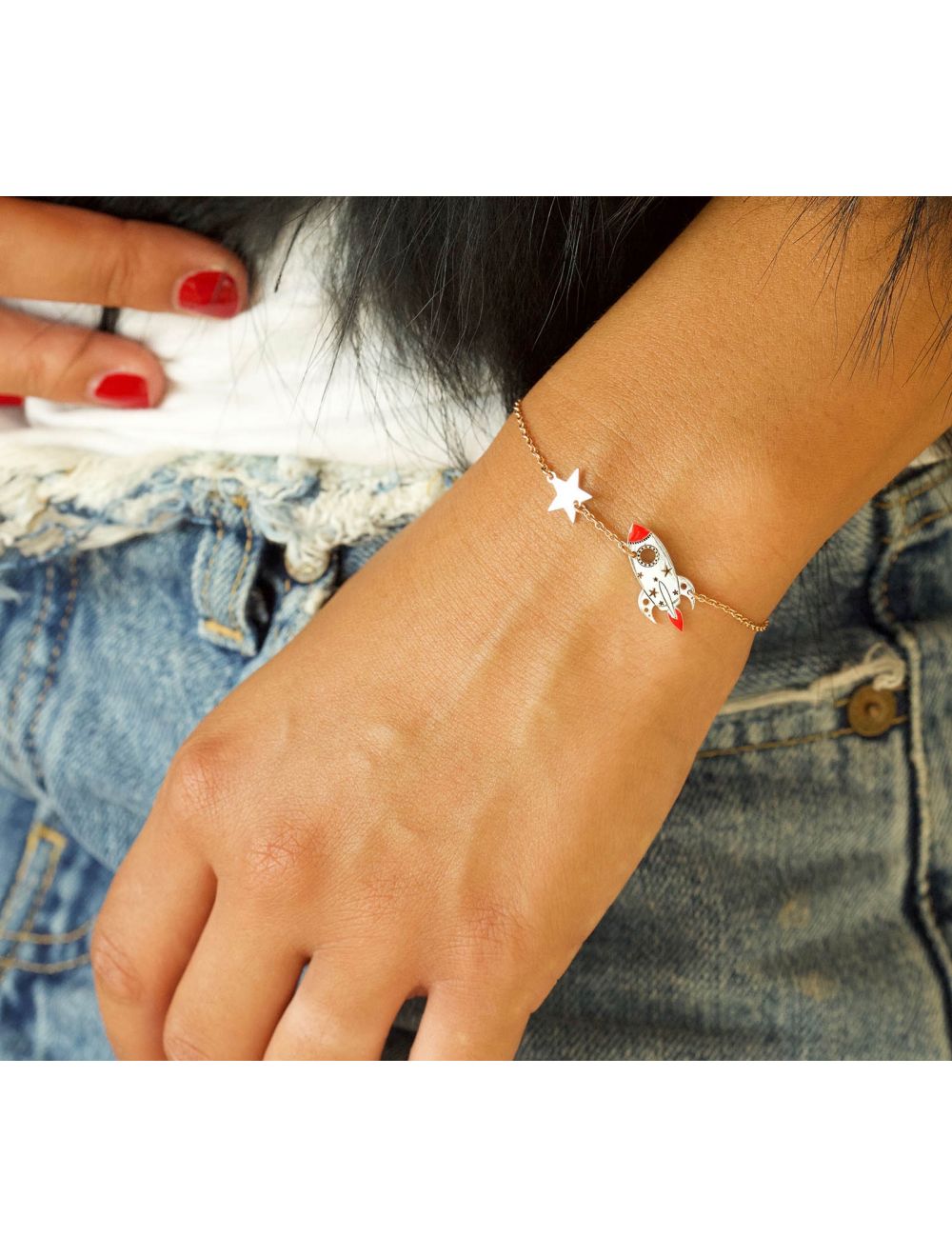 Bracciale realizzato con catena di argento 925 placcato in oro rosa ad alto spessore ed alta resistenza. Stella con galvanica oro rosa e razzo in argento e smalto rosso.