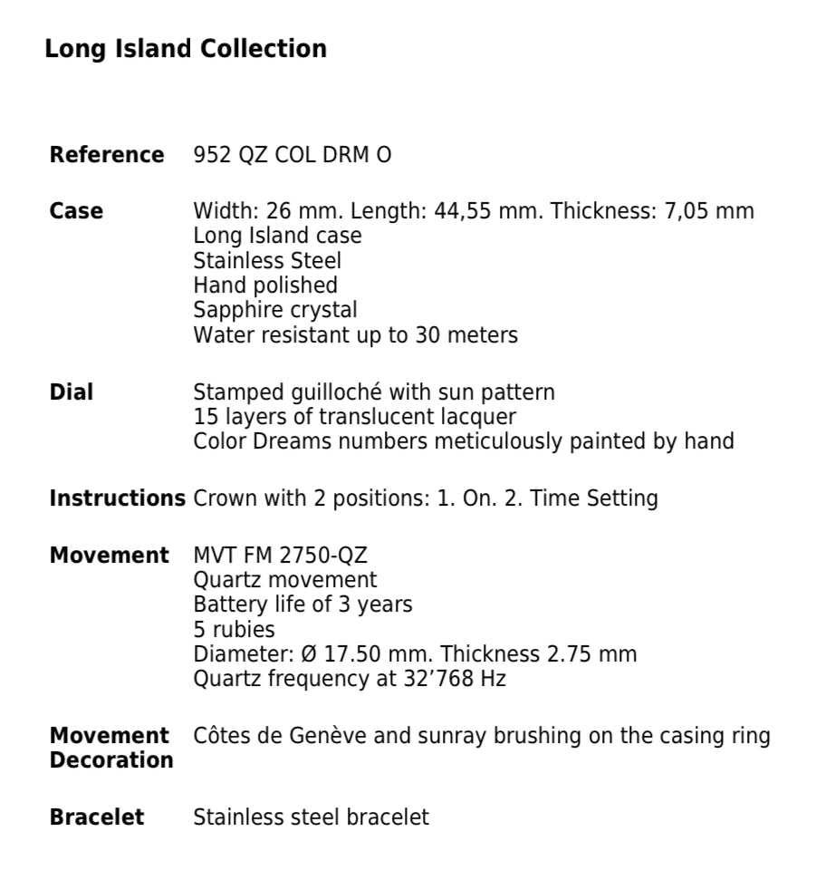 L’architettura della linea Long Island™ rende omaggio al movimento Art Déco in una nuova visione dello stile Novecento. Con la sua forma rettangolare, Long Island è diventata una collezione emblematica di Franck Muller. Dagli accattivanti numeri Color Dreams agli eleganti diamanti che adornano la cassa, dai colorati cinturini in alligatore agli impeccabili quadranti, ogni singolo dettaglio della collezione Long Island è stato progettato con cura e attenzione per rispecchiare la bellezza di chi la indossa.