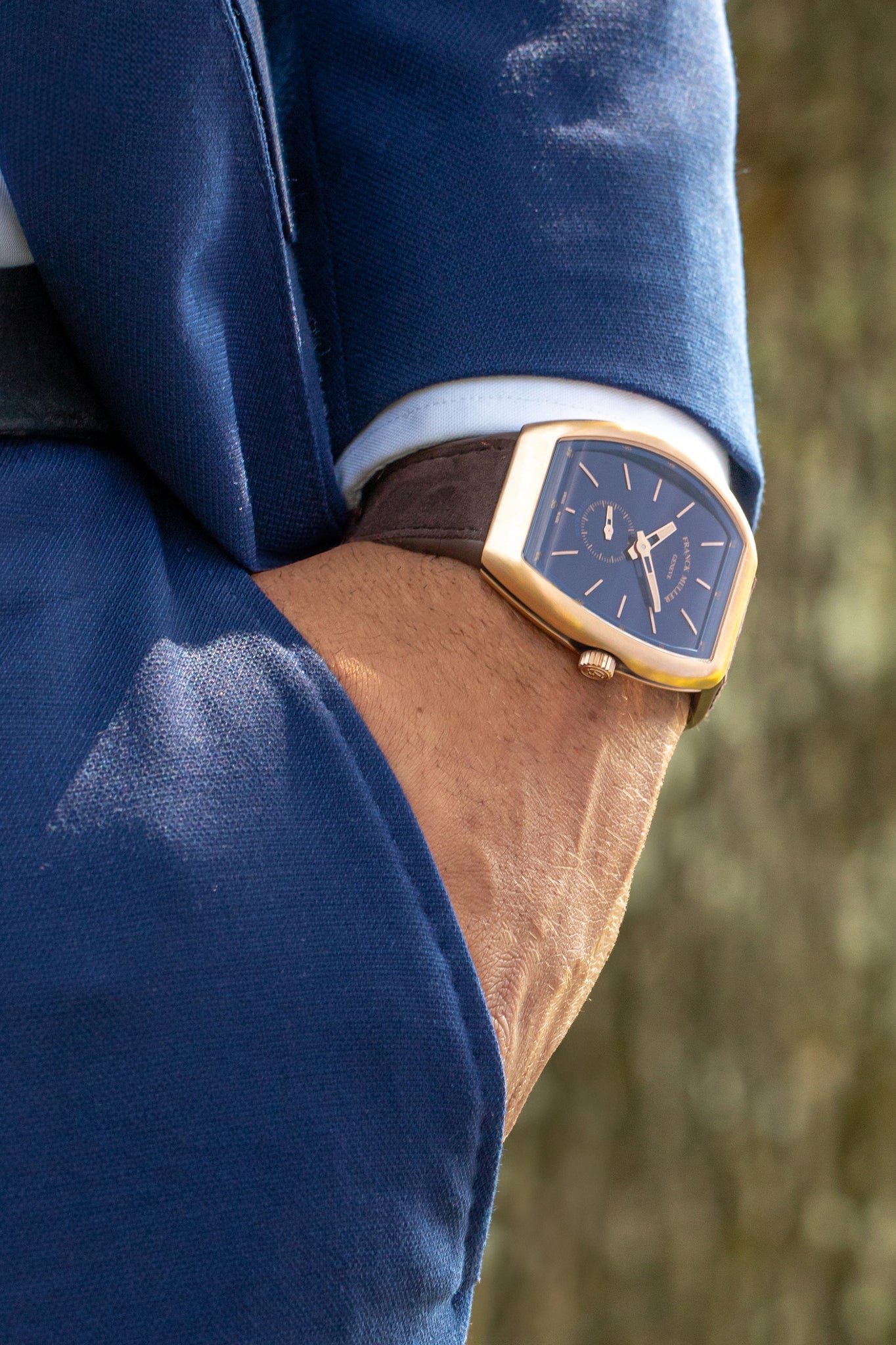 In questa creazione, l'OLTREMARE, tradizione orologiera e movimenti di manifattura si fondono in un classico e moderno espressioni di orologio, la cassa Vanguard è la prima di questa linea.